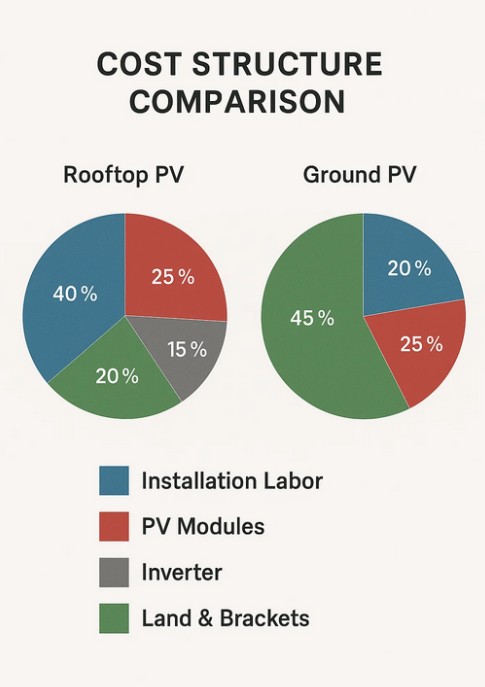 Cena je dôležitým faktorom pri porovnávaní týchto dvoch systémov. Strešné fotovoltaické systémy majú vo všeobecnosti nižšie náklady na využitie pôdy, pretože využívajú existujúce stavebné konštrukcie. Zložitosť inštalácie však môže zvýšiť náklady, ak majú strechy nepravidelné tvary alebo vyžadujú spevnenie. Pozemné fotovoltaické systémy majú zvyčajne vyššie počiatočné náklady v dôsledku prípravy pozemku, konštrukcie základov a nosných konštrukcií. Napriek tomu pozemné systémy často umožňujú úspory z rozsahu, vďaka čomu sú nákladovo efektívne pre veľké projekty. Celkové investičné rozhodnutie závisí od dostupných zdrojov pôdy, očakávaného energetického výkonu a dlhodobej návratnosti investície.